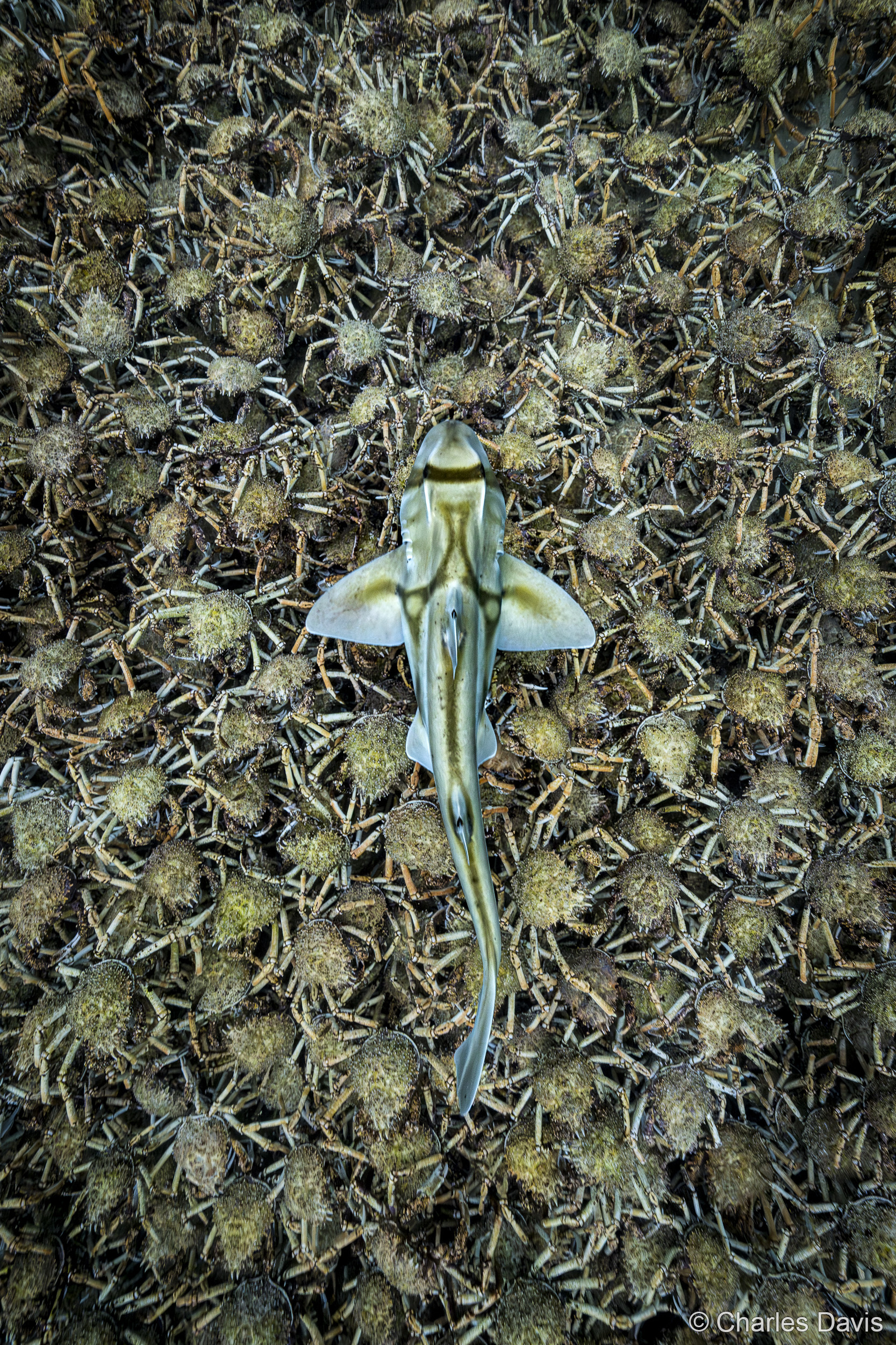 “Each year, on the full moon, tens of thousands of spider crabs gather to shed their shells. At this time, they become soft and vulnerable to predation from sharks and large rays, so they bunch up in epic numbers to protect themselves. This Port Jackson shark was cruising over the hoard.” – Charles Davis