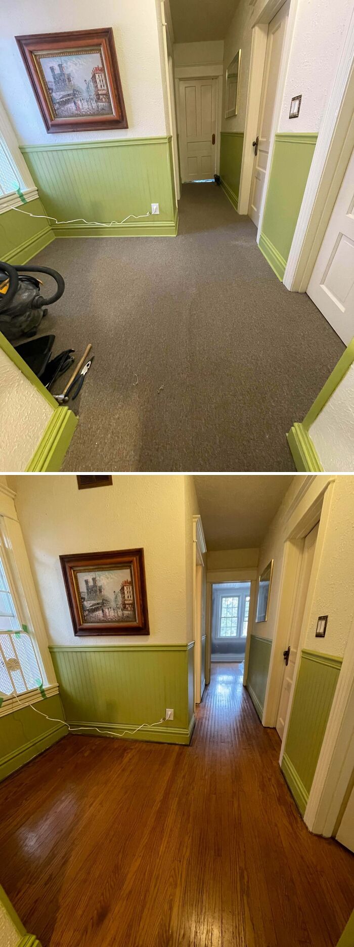 Ripped up an absolutely horrific yellow shag carpet, and some sort of gray commercial office space carpet, then a layer of disgusting foam padding and this was hidden under it all. It’s like finding buried treasure!!