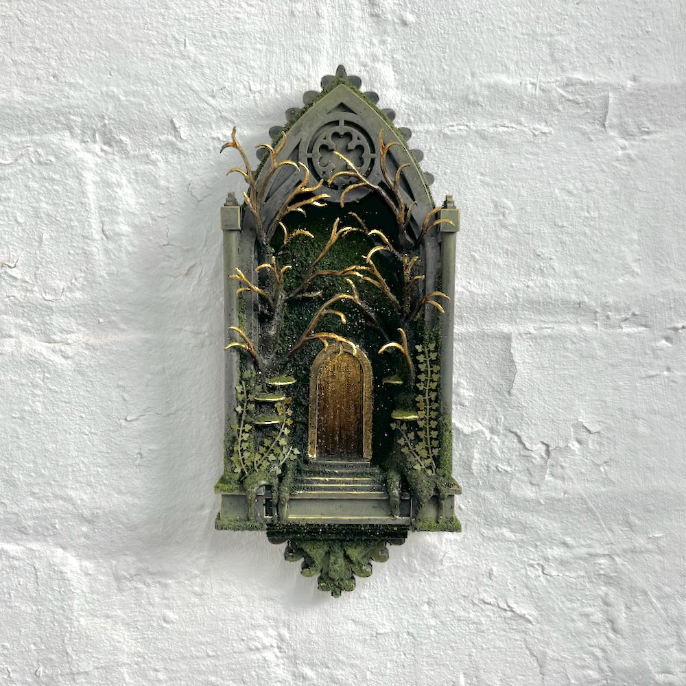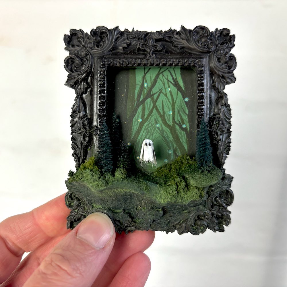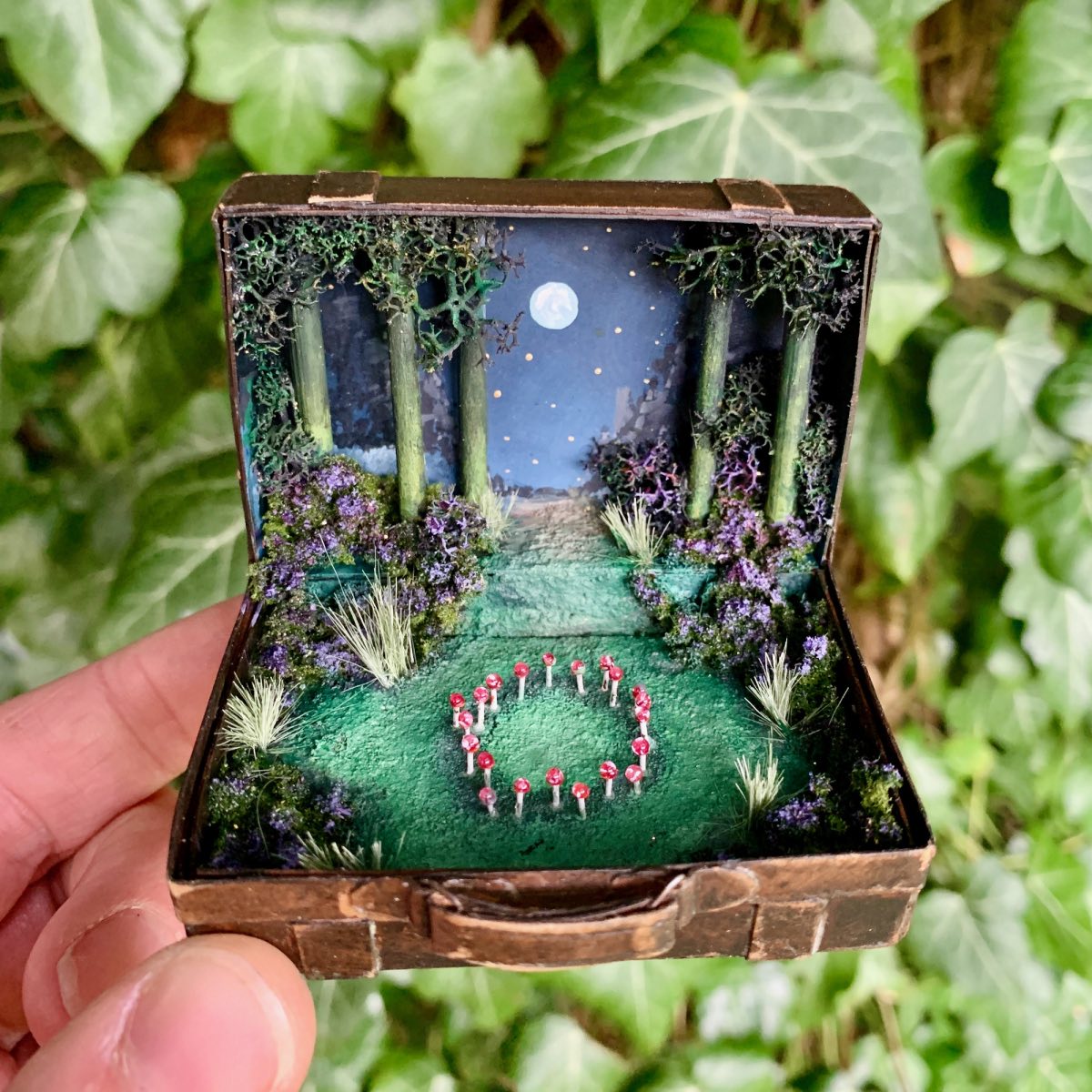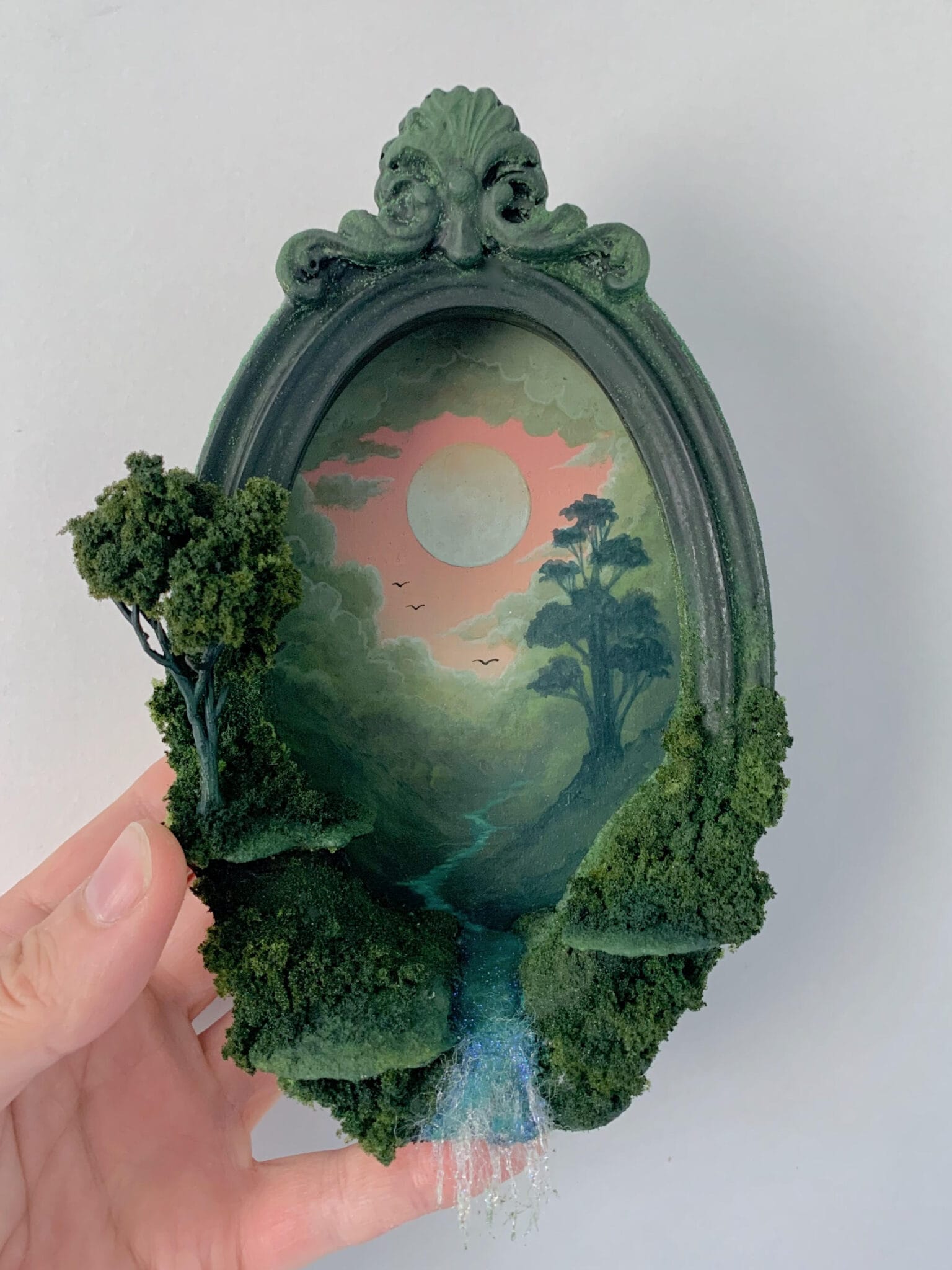 Caroline Dewison’s newest 3D mini art pieces capture lush forests, cascading waterfalls, and ethereal ghosts within tiny frames. Previously recognised for miniature sci-fi scenes with hovering UFOs, Dewison now turns to magical realms, continuing to blend in extraterrestrial touches.