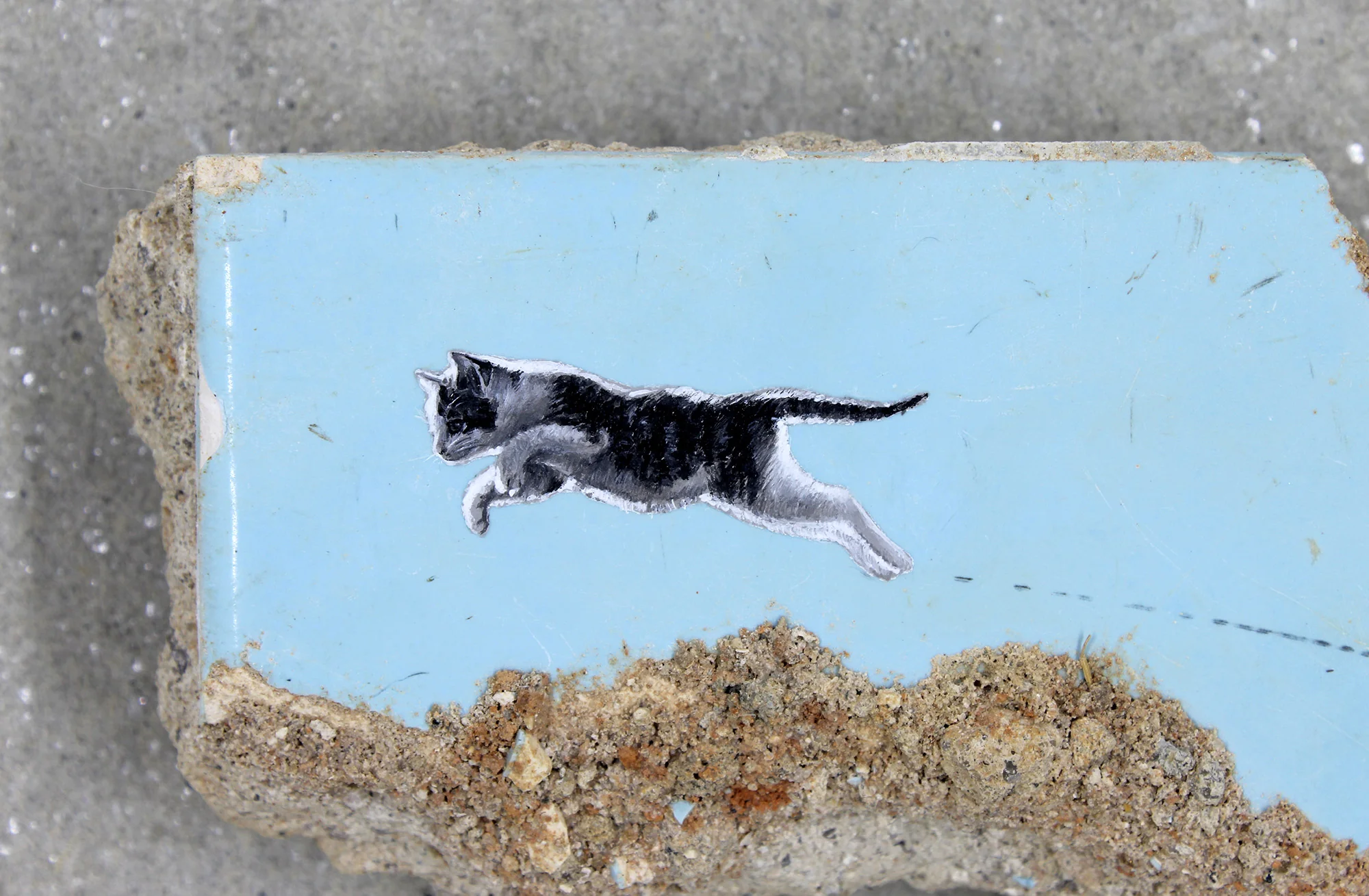 #5 William Mophos, “Tom Tom” (2025), acrylic painting on wall fragments in an acrylic frame with cement board backing, 16.6 x 21 x 7.5 centimeters