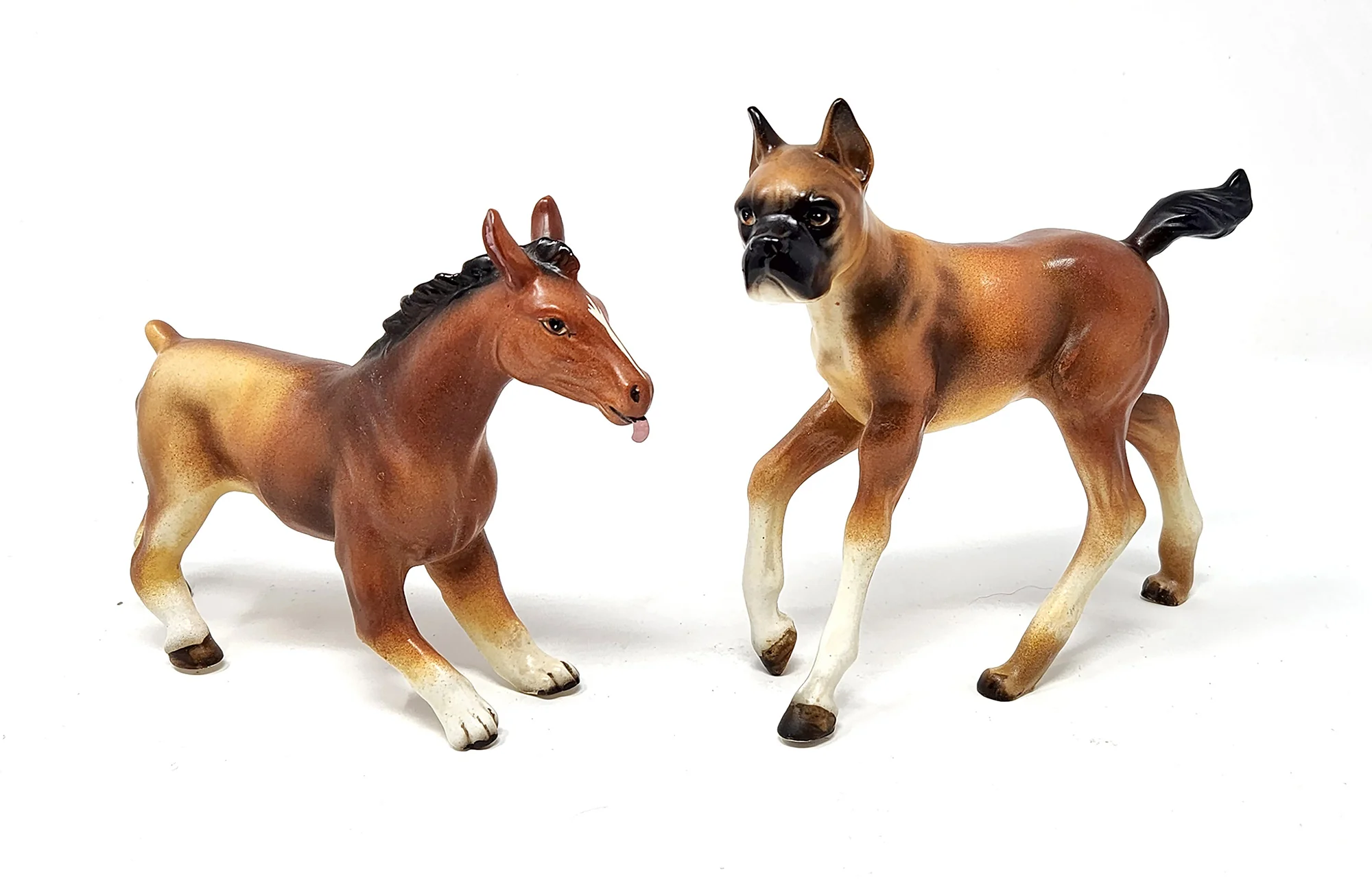 #3 Debra Broz, “Horse Boxer” and “Boxer Horse” (2025), secondhand ceramic figurines and mixed media