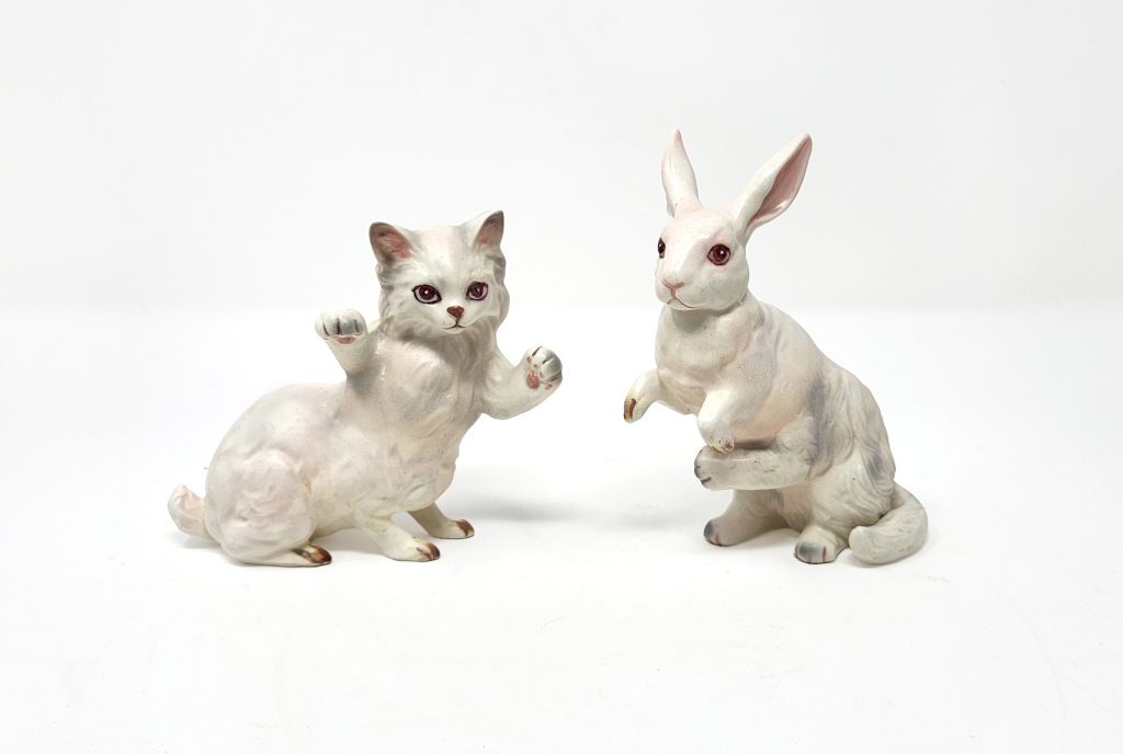 #9 Debra Broz, left: “White Persian Cat Rabbit,” (2025), secondhand ceramic figurines and mixed media, 4.25 × 5 × 2 inches; right: “White Rabbit Persian Cat,” (2025), secondhand ceramic figurines and mixed media, 5 × 4 × 2.5 inches