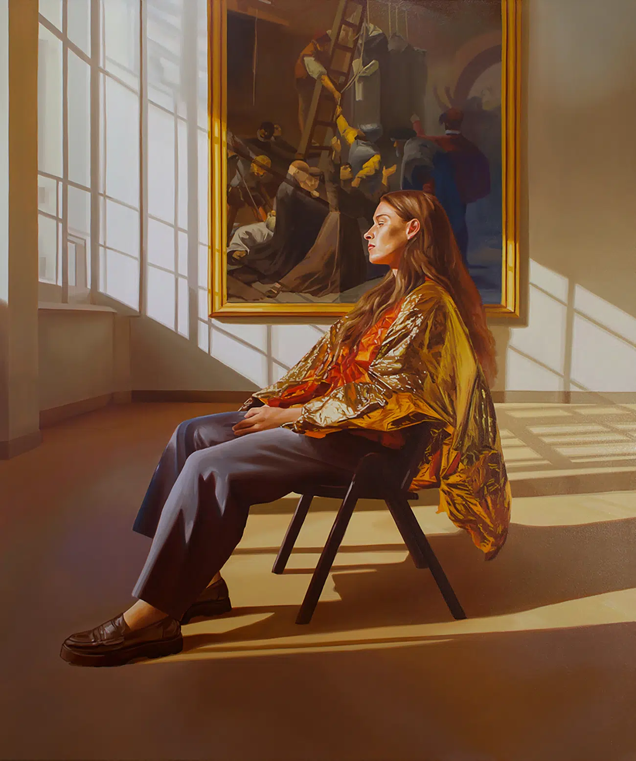 His series “Ornamental” showcases figures set against serene natural scenes, as well as more familiar suburban environments. Some subjects sit quietly in calm, pastoral backdrops, while others recline in everyday neighbourhood settings. In each piece, they are draped in shimmering golden “blankets” that seem to catch and reflect light in captivating ways. By painting people of different genders and placing them in these meditative poses, wrapped in gold, Rice invites viewers to bring their own interpretations to the work.