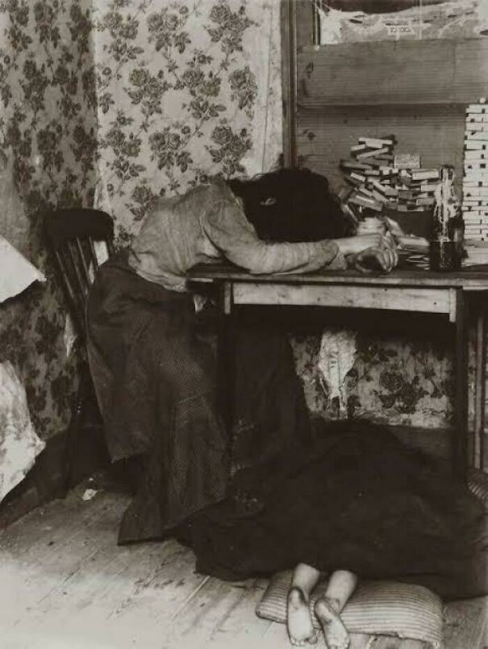 #39 A Worn-Out Mother Making Matchboxes, Her Child Sleeping Under The Table – London, Circa 1900