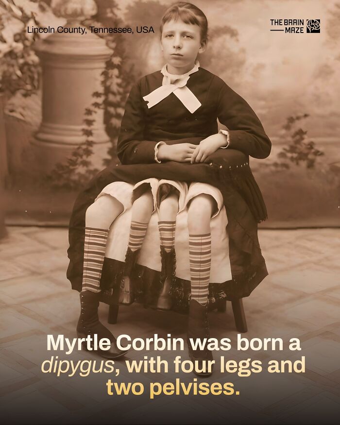 Myrtle Corbin was born in 1868 in Tennessee with a rare condition called dipygus, which caused her to have two pelvises and four legs.
