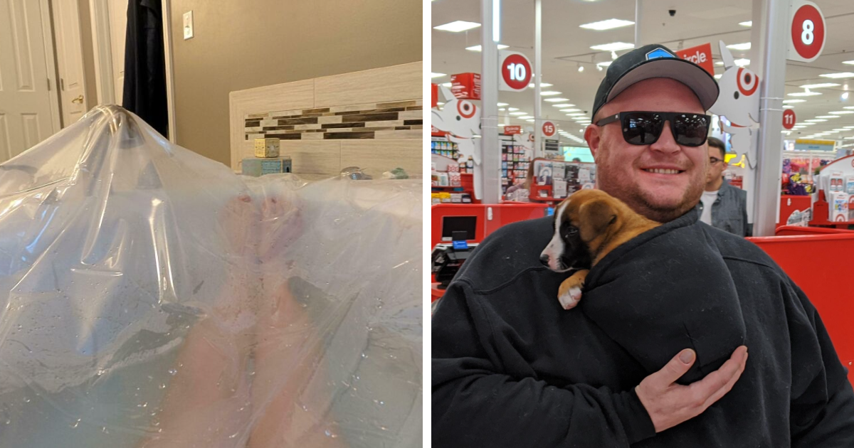 #1 This Gentleman At Target Who Reversed His Hooded Sweatshirt To Make A Puppy Pocket