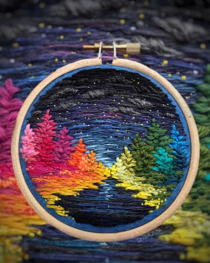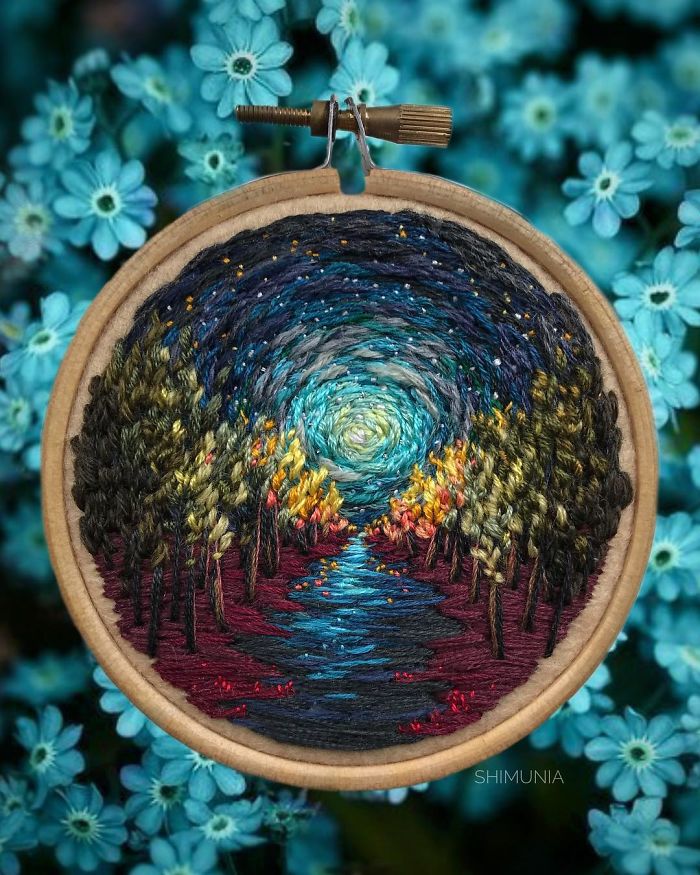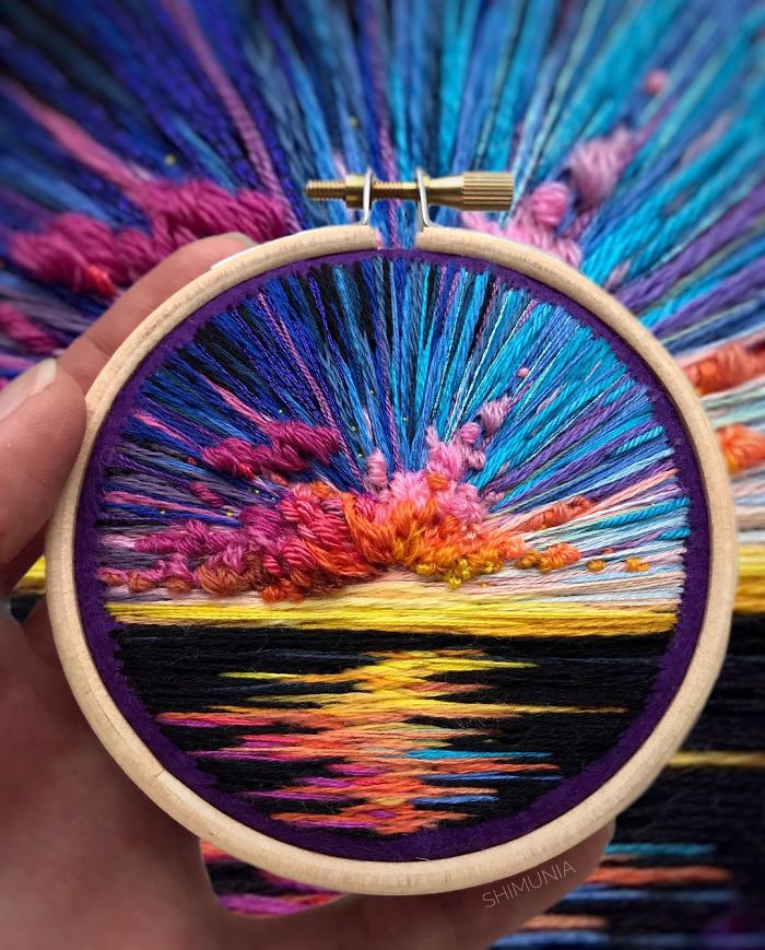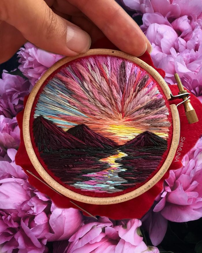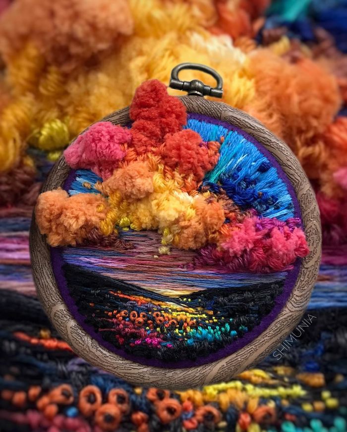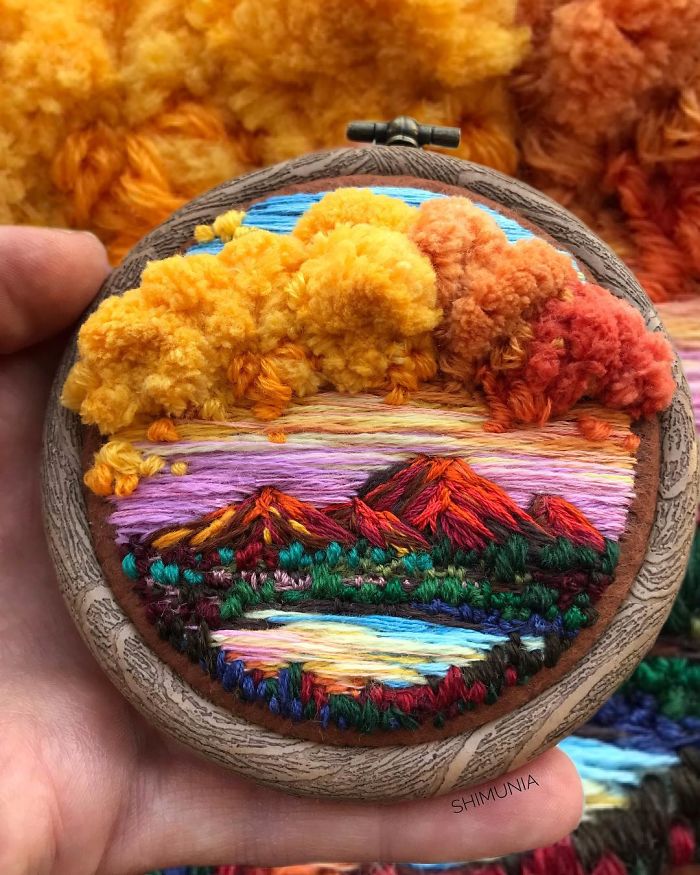 Some artists paint with oils or watercolors, but Vera Shimunia paints with thread. Her embroidery pieces burst with color, depth, and texture, often looking more like vivid landscape paintings than stitched fabric. What began as a simple experiment quickly turned into a passion. “I just decided to try. And when I made my first embroidery pattern, the boy I liked, he has great taste and he is in the art community, wrote me: ‘you did this?? So cool’ and I decided to continue,” Shimunia told us in an interview.