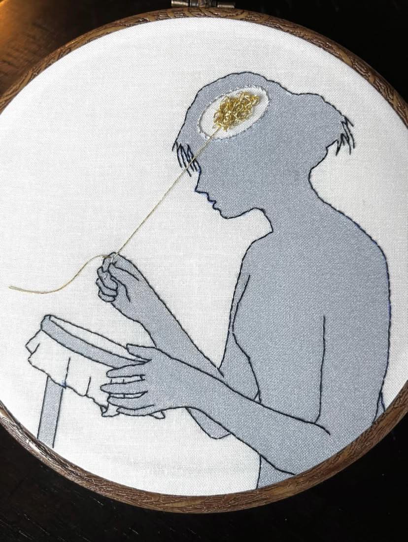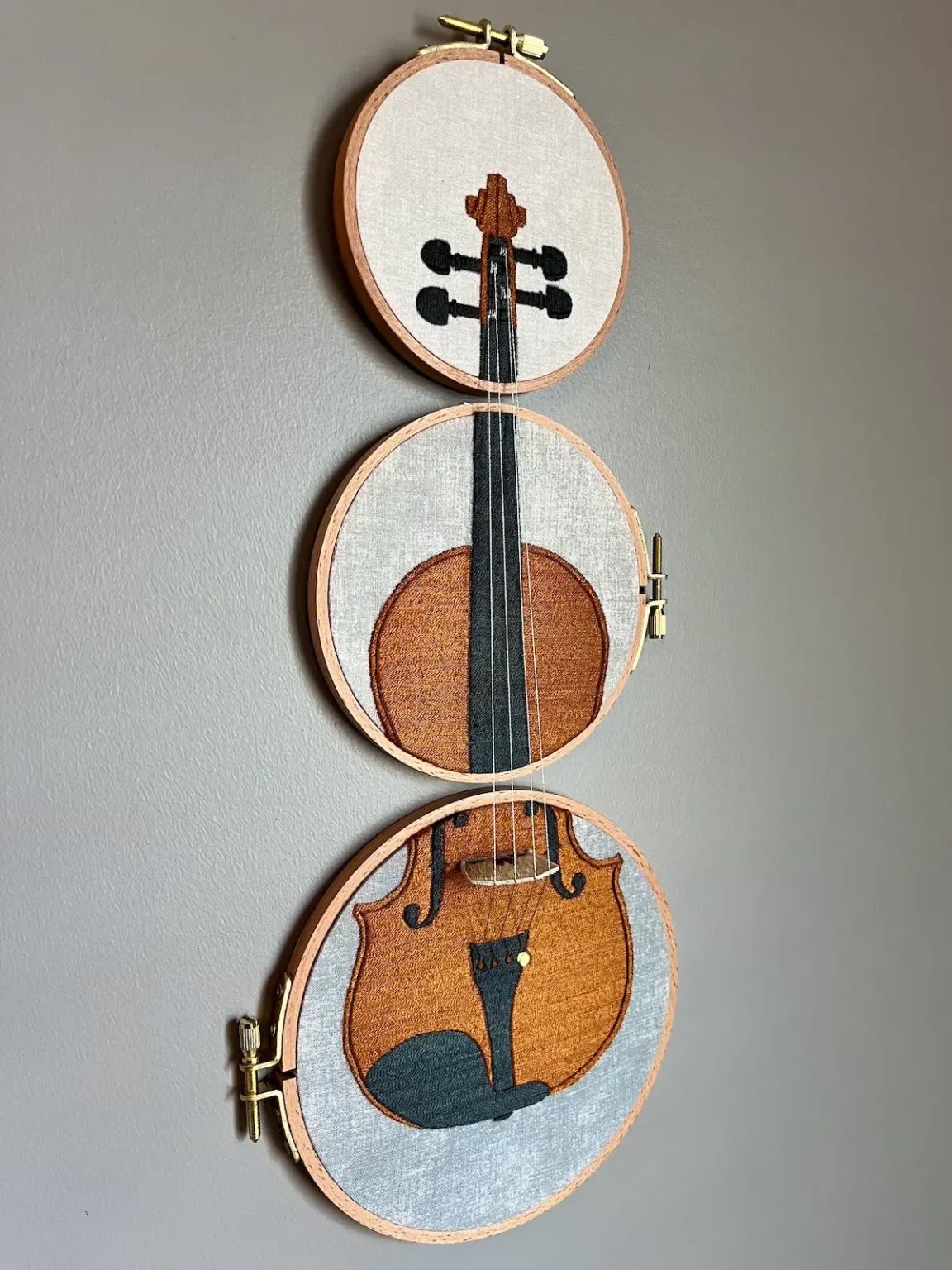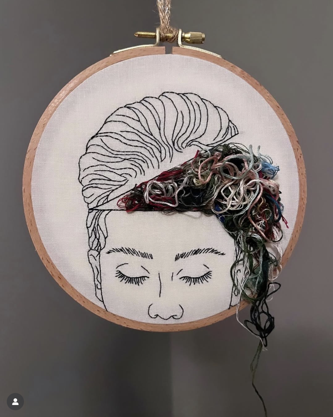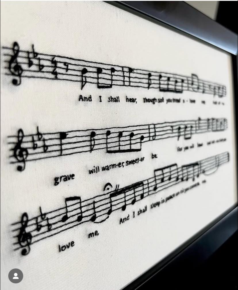 Each piece has a playful element, and Boyd says most of her work is inspired by the things she loves. With a degree in classical music, she often emulates the look of music sheets in her pieces. More recently, her love of reading has led her to stitch on the covers of books she enjoys. Her loving family also inspires pieces based on memorable phrases or interactions she shares with them. Under the moniker “Thistles and Threads,” Boyd has experimented with many stitching designs that continue to impress and delight fans of her work.