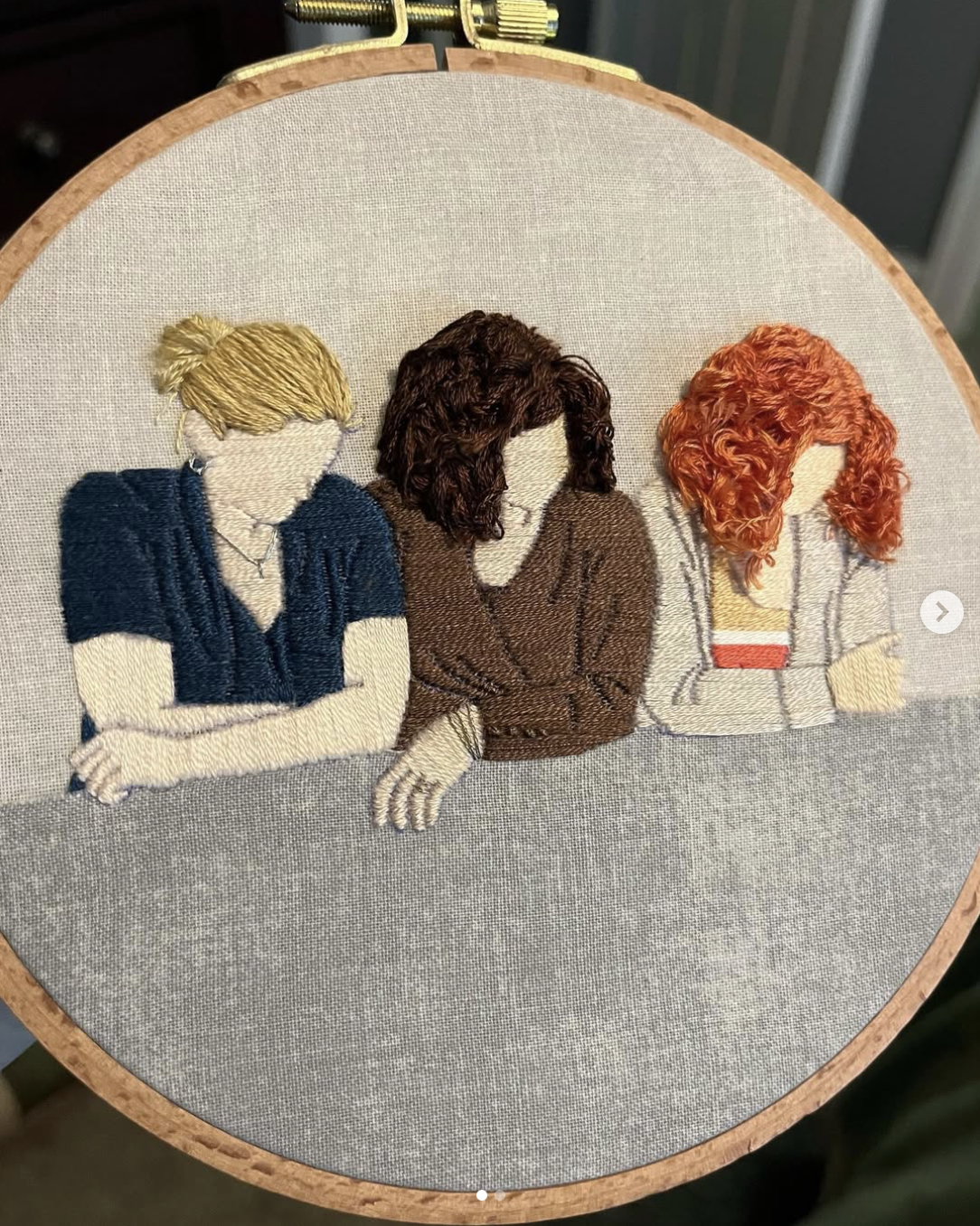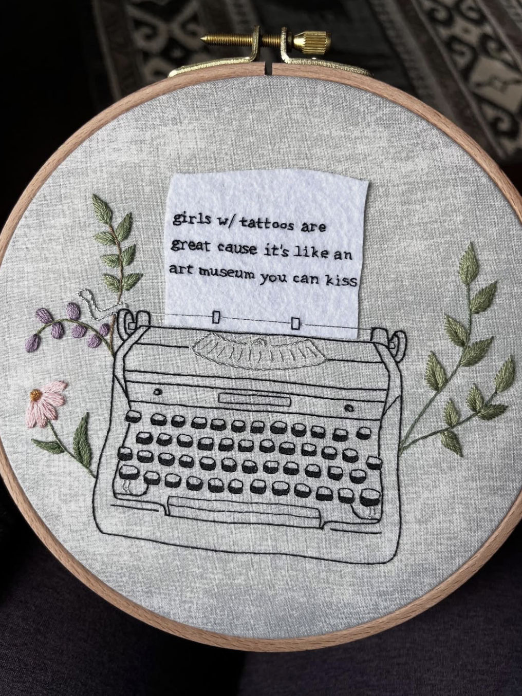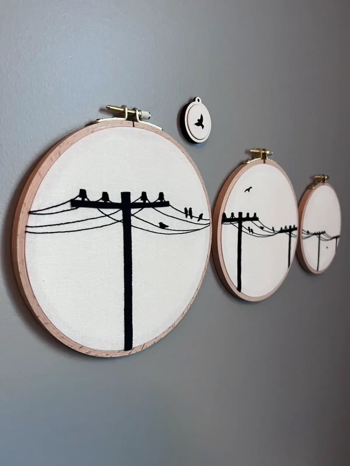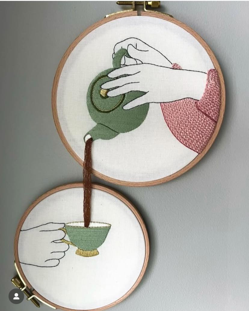 Each piece has a playful element, and Boyd says most of her work is inspired by the things she loves. With a degree in classical music, she often emulates the look of music sheets in her pieces. More recently, her love of reading has led her to stitch on the covers of books she enjoys. Her loving family also inspires pieces based on memorable phrases or interactions she shares with them. Under the moniker “Thistles and Threads,” Boyd has experimented with many stitching designs that continue to impress and delight fans of her work.