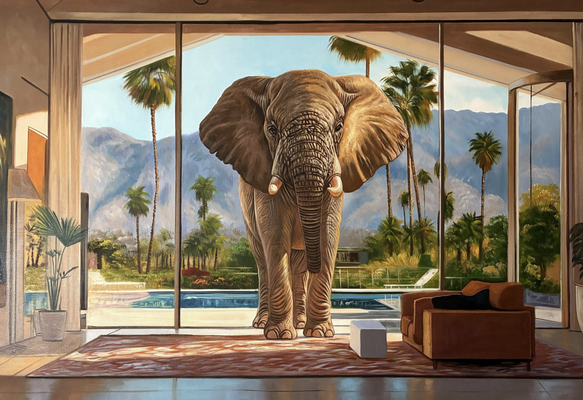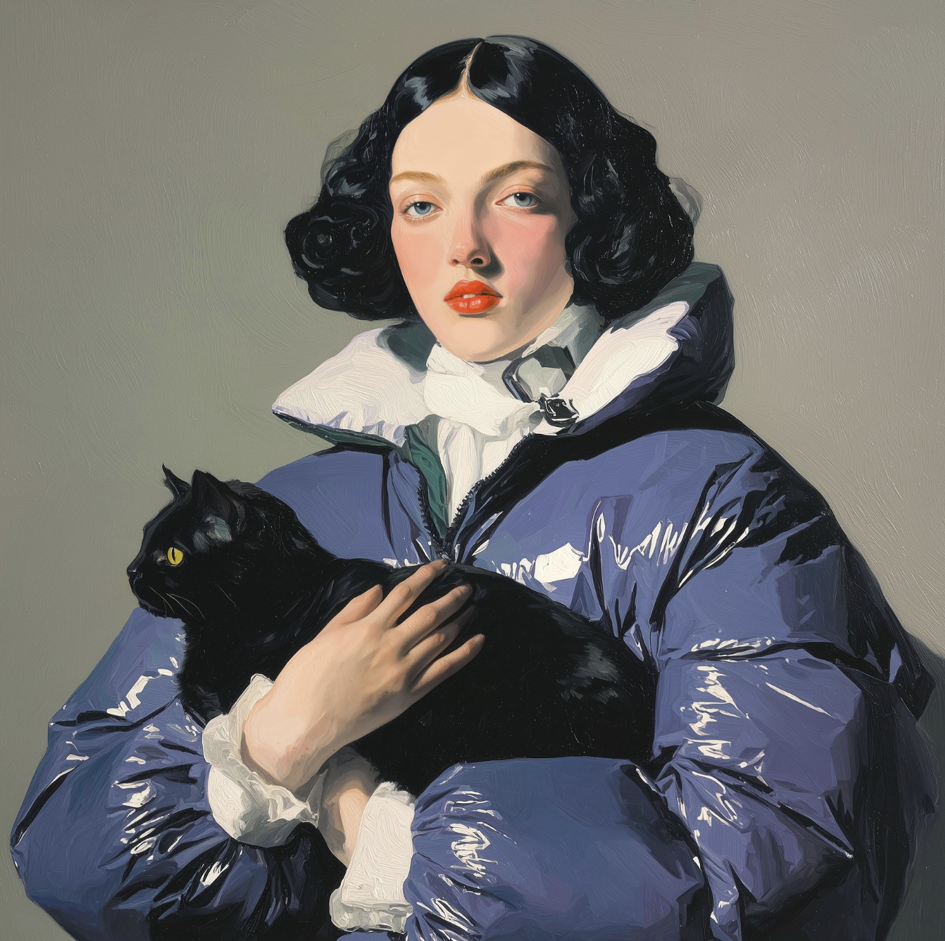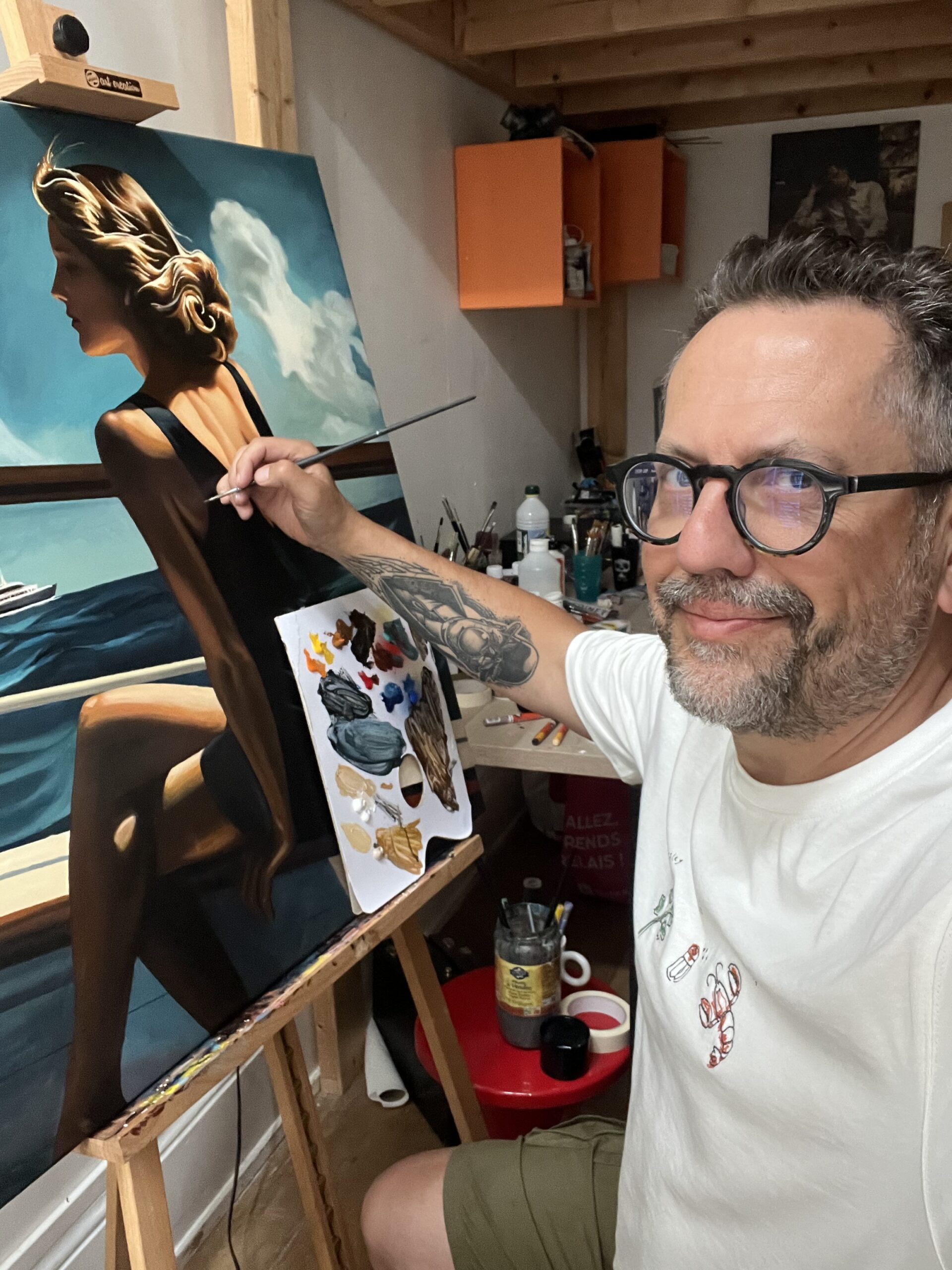 All of this creativity happens within Pelletier’s dedicated studio space, where history and contemporary flair harmoniously collide. The creative process usually begins on the computer, combining digital research and tools like AI to explore ideas, before finalising the image in Photoshop. Once the concept is set, the work moves to canvas, where oil paint brings depth and feeling. Each piece aims to be both realistic and poetic—open for viewers to find their own meaning within the art.