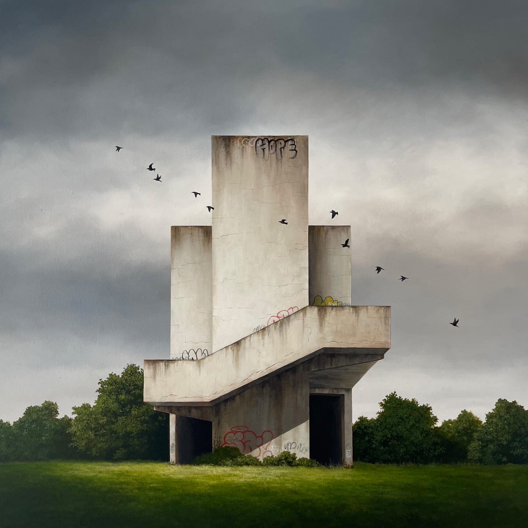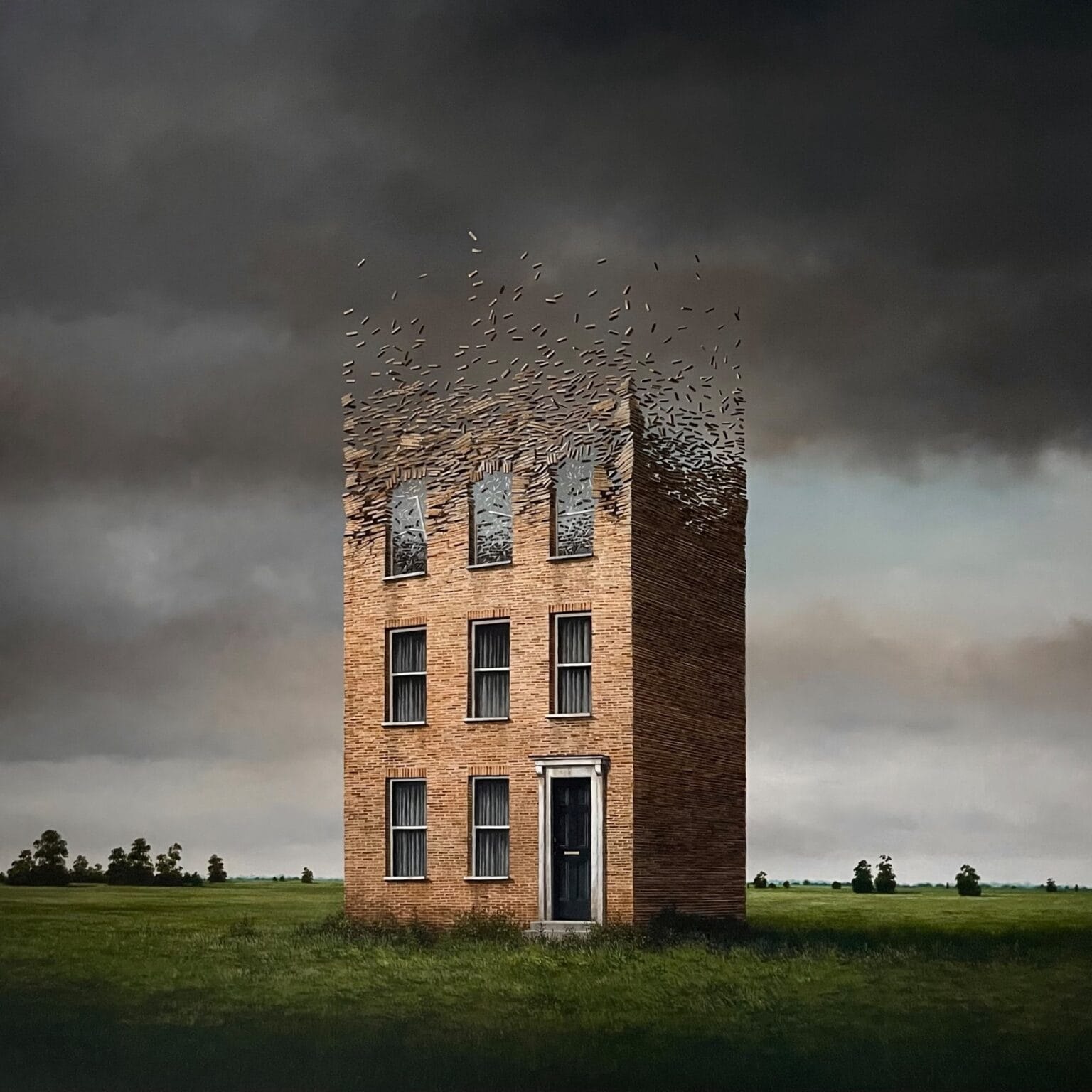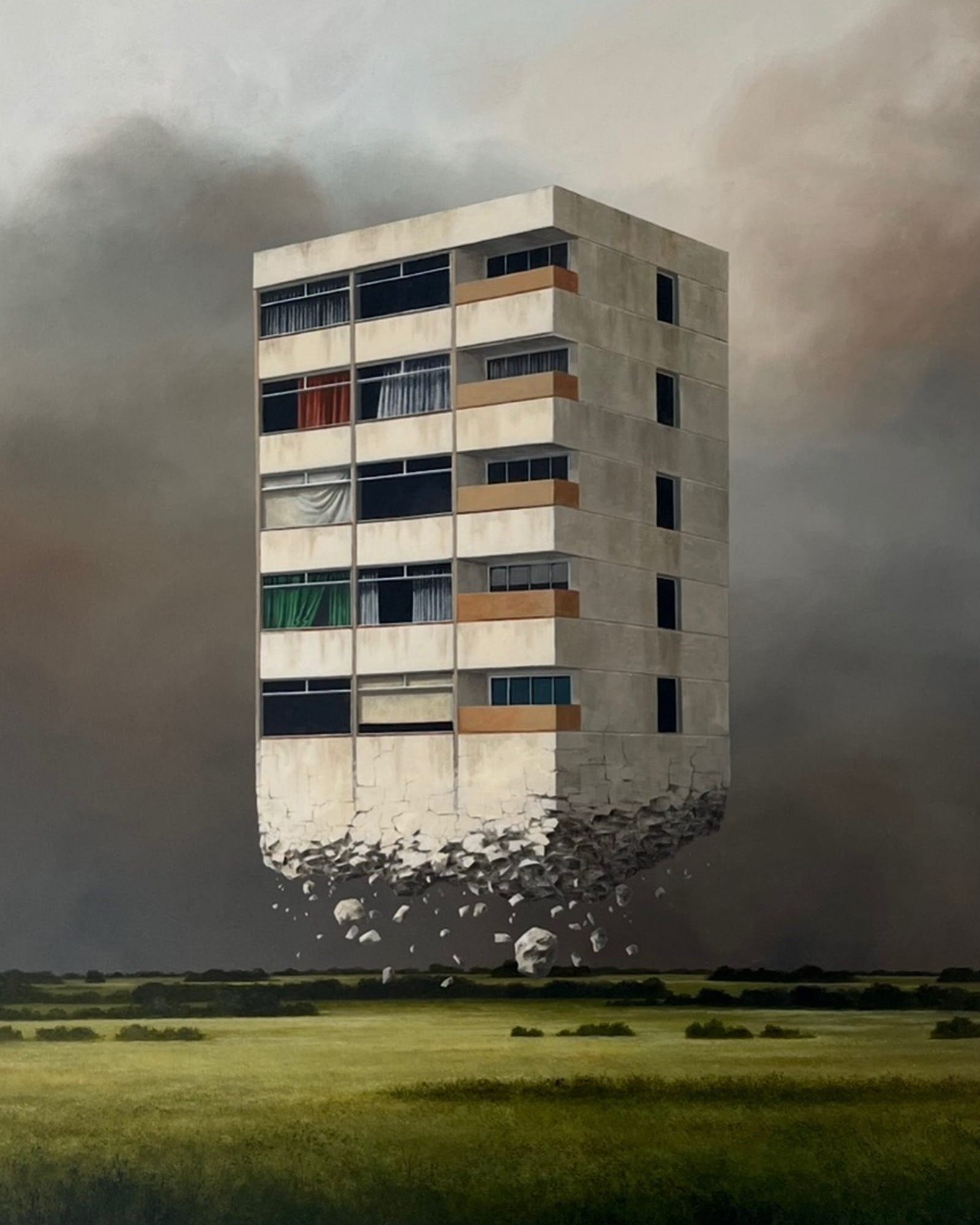 In many of his works, it feels like you can almost piece together the story of some unseen disaster. The dystopian settings seem to rise right off the canvas, each sombre illustration hinting at lost lives, conversations, and laughter that now linger only as silent echoes.
