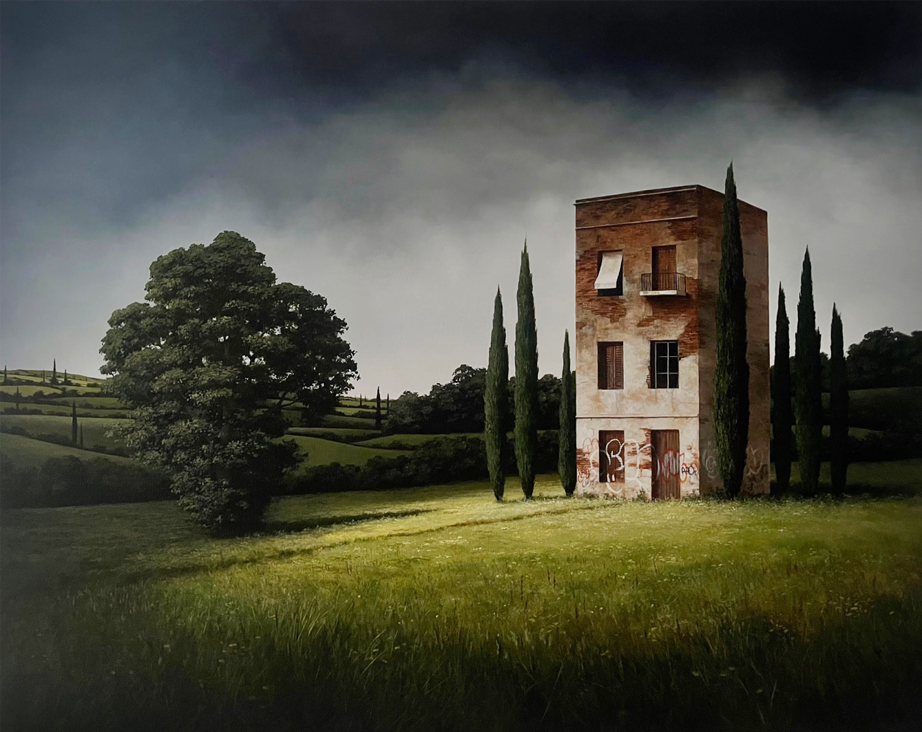 Further elaborating on his creative process, Madgwick revealed, “I paint in water-mixable oils and acrylic and describe my work as ‘imagined realism.’ The skies are painted with gloved hands and fingertips, and after several weeks of drying time, I then focus on the detailed areas using acrylic paint. I like to add a touch of intrigue and leave it to the viewer to come up with their own interpretations and to question what they are seeing. Who inhabits these places? What lives do they lead? What has happened or what’s about to happen?”