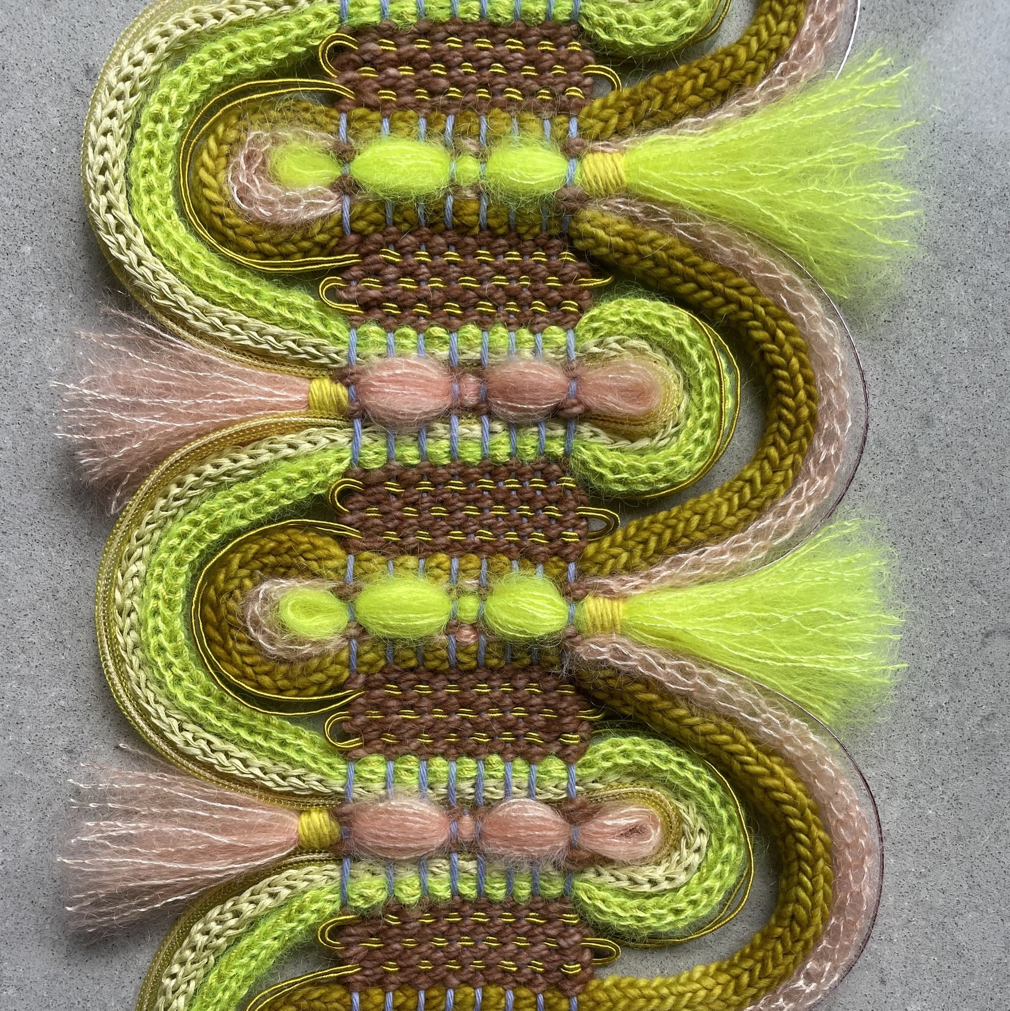 The artist discovered that spinning fibre significantly helped her reduce her over-thinking patterns. The act of spinning, Robinson has claimed, helped put her in an unexpected meditative state that is in stark contrast to the complex pre-planning involved in passementerie. Lately, the Australian artist has been experimenting with different fibres, yarn deniers, and colour palettes. Her handspun crafts are vibrant designs that are a unique addition to any home. Her explorations into ‘colour therapy’ as she fondly calls it have led her to braid, weave and spin her way into creating intricate wall hangings that puff, curve and meander in vivid detail.