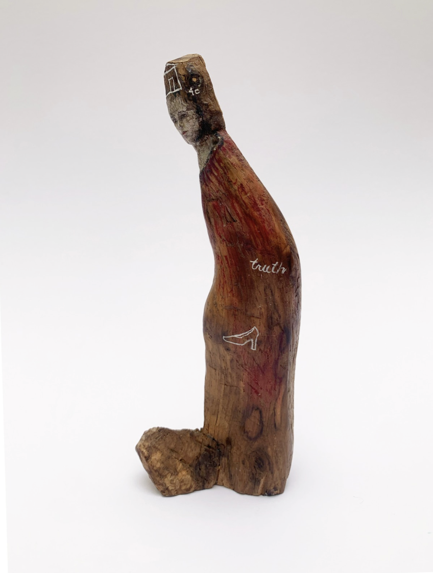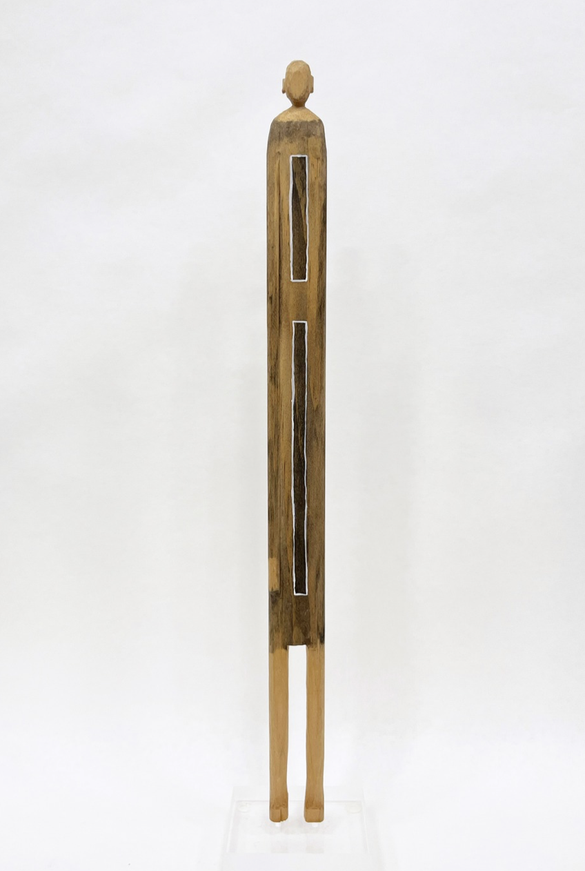 Szeto exclusively uses salvaged wood from her woodworker friend’s shop, found kindling, driftwood, and birch branches for this project. In her own words, she explains, “I have always utilised repurposed materials throughout my work. The paint brushes for my portraits were just one of many accessible raw materials. The totem-like works actually predated the Paintbrush Portraits by five years, originally carved from discarded stretcher bars. The Totem series returned due to my friendship with a woodworker in my studio building. I would look through his bins for long, thin wood trimmings. My approach is rooted in using what’s available nearby, adopting a ‘waste not, want not’ philosophy. This also helps me stay present. The Totem pieces are more emotionally motivated, universal reflections on the human condition rather than specific cultural constructs like art history or politics.”