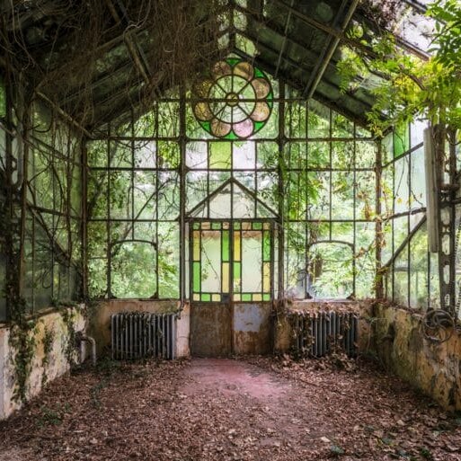 Veillon went on to explain his deep fascination with the discarded heritages of mankind and what draws him to the mystery of forgotten houses, factories, and now these overgrown glass structures. He remarked, “First, it’s a lot of research to find those places! Hours online searching for historical clues that can help me locate the location I want to photograph. Spending a huge amount of time on Maps and trying to see if some buildings could be buried under vegetation or look abandoned, for example.”