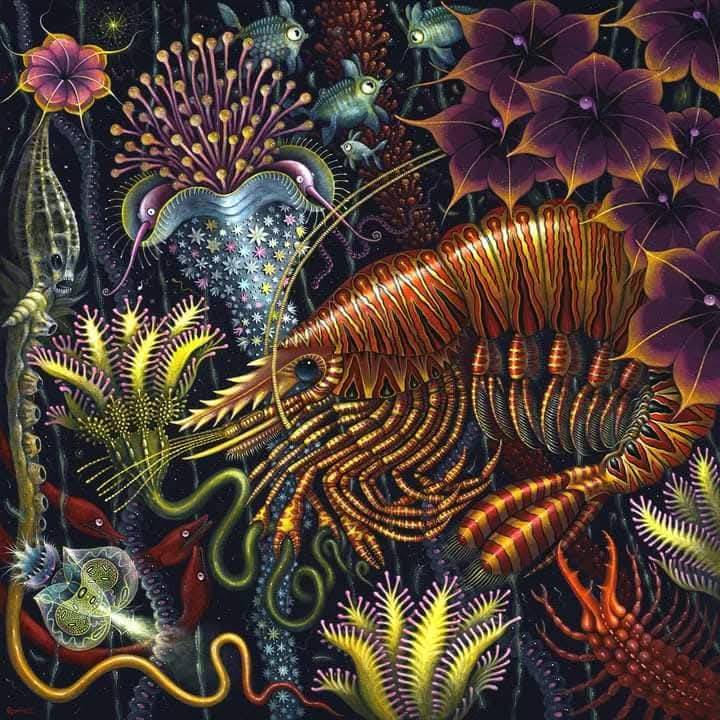 Connett’s paintings blur the line between the beautiful and the bizarre. Using intricate detail and a deep understanding of biology, he creates entire ecosystems that feel alive, filled with writhing organisms, glowing sea creatures, and fantastical beings that belong to another dimension. His work reminds us that nature isn’t just pretty sunsets and soft petals; it’s strange, alien, and endlessly creative.