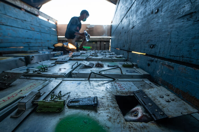 “A macaque peers out from its transport box, trying to observe what happens outside during its journey to be reintroduced into the wild.
